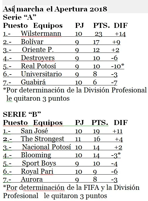 triunfos de Wilstermann, líder absoluto de la Serie “A” y San José puntero de